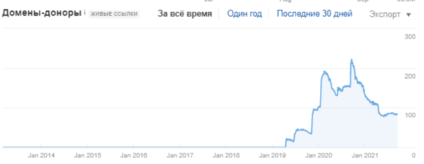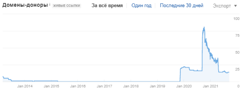 Так як домен новорег, то у сайту була відсутня посилальна маса. Насамперед на початку роботи довелося підклеювати дропи. Загалом підклеювання дропів по ходу роботи стало регулярним, що видно на графіку доменів-донорів як посилальні вибухи.
