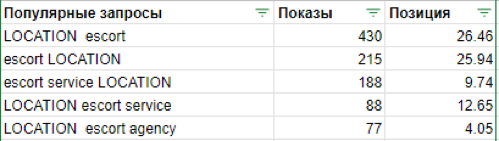 Позиції щодо основних ключових запитів та їх покази згідно Google Search Console